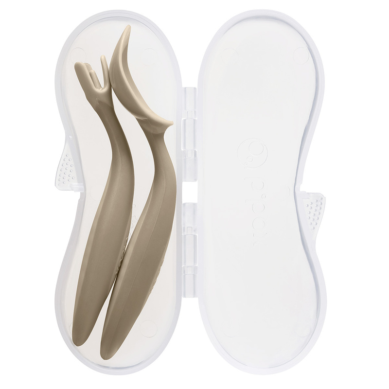 W zestawie znajdziesz łyżkę o pogłębionym kształcie oraz unikalny flork – połączenie widelca i łyżki, zaprojektowany tak, by był bezpieczny i skuteczny. Uchwyt został dostosowany do sposobu trzymania sztućców przez małe dłonie – nie prosty, lecz ergonomicznie zakrzywiony.